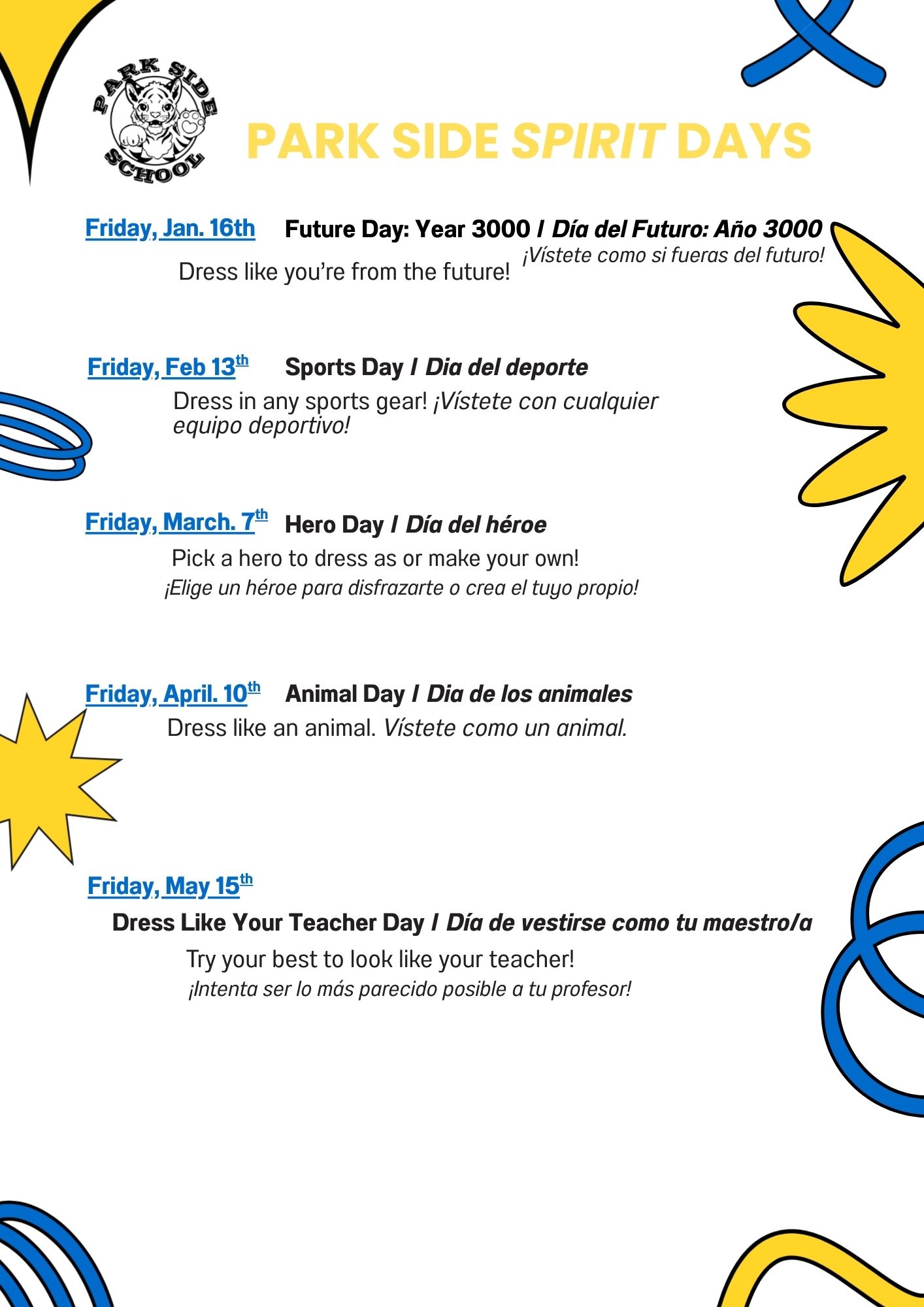 Dress from any year in the future! What will they wear? What will be in style? We can't wait to see what you come up with! And remember that every Tuesday is Tiger Tuesday where students and staff are invited to wear logo wear and/or tiger cub blue!